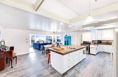 Located down a quiet road, this recently updated and inviting ground-level getaway is the perfect home base for your next family vacation in spectacular Mendocino! Inside this modern, sunlit home, you'll find a well-equipped full kitchen, a large dining table for meals or family game nights, and a living area with a cable-equipped flatscreen TV and a warming wood stove. This home also includes a game room with a full-size pool table and table-top arcade for when you're craving a little friendly competition. Outside, you'll find a soothing, private hot tub, side-by-side picnic tables, and chairs where you can sit and watch the ocean as you sip your coffee or a local microbrew.