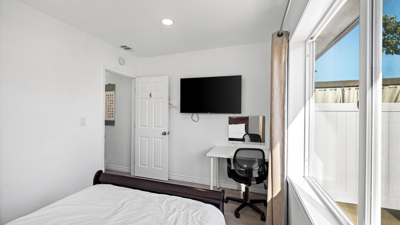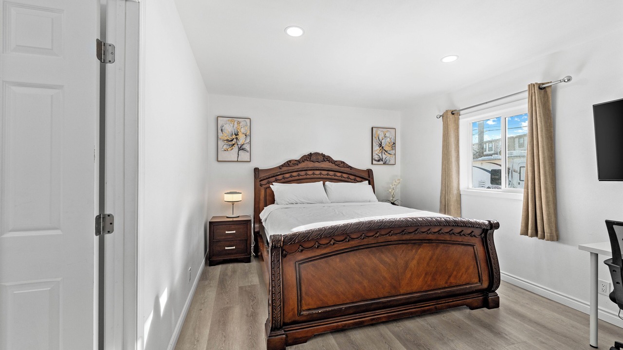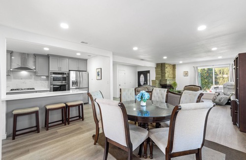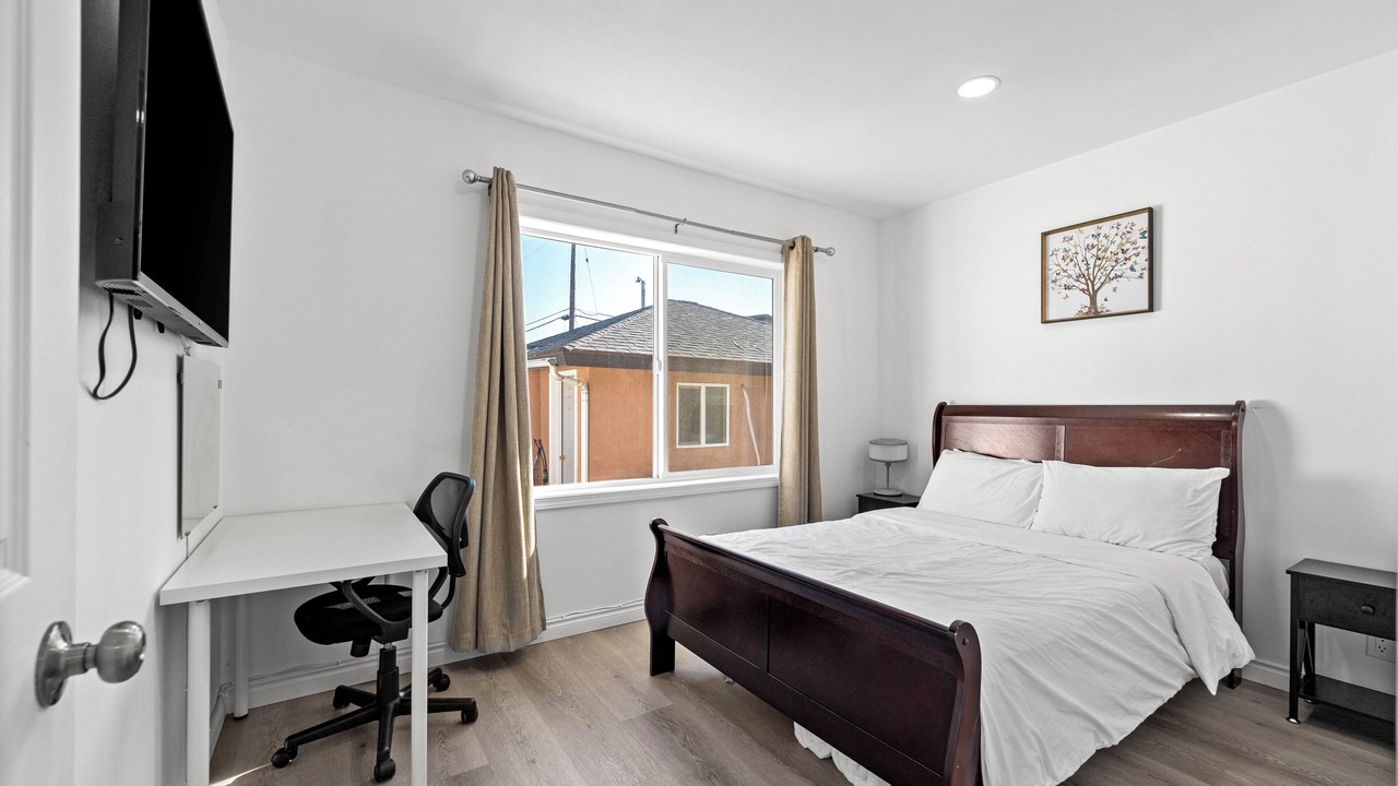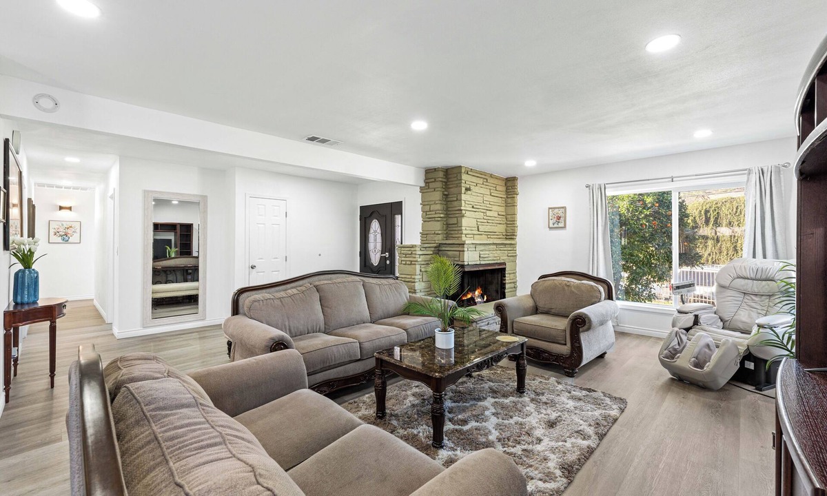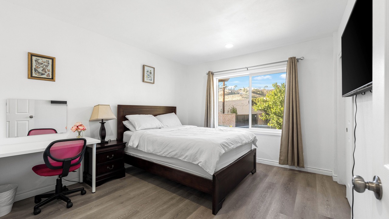 Relax in this updated 4-bedroom, 3-bathroom home in central Pomona—just minutes from Highway 10. Perfect for families or business travelers, it features two en-suite bedrooms, smart TVs in every room, a fully equipped kitchen, and cozy shared spaces.
