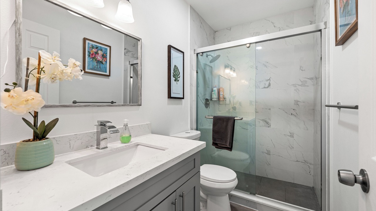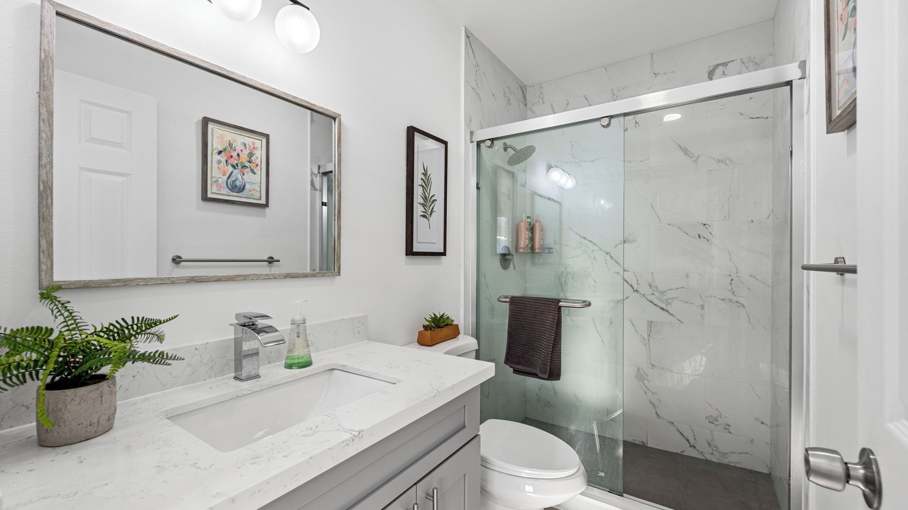 This 4-bedroom, 3-bathroom home is designed for comfort and convenience. Two bedrooms have private en-suite bathrooms, while the other two share a third bathroom.