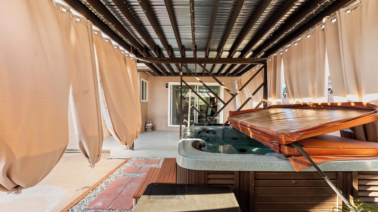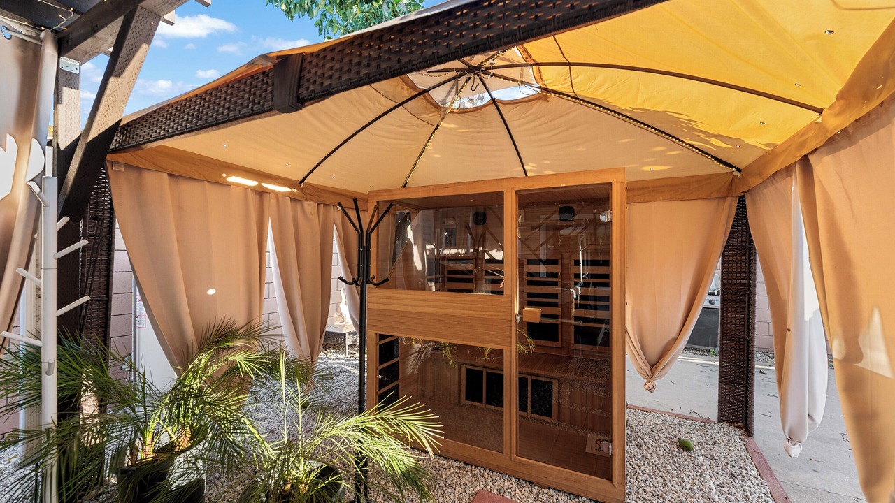 Unwind in the backyard with a heated hot tub and sauna after a long day.