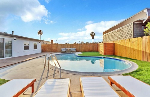 Luxury remodeled home in the center of San Diego with fully furnished yard, POOL + fire pit! Welcome to your private vacation oasis for your trip to America's finest city. Our fully private home is where the convenience and comfort of a spacious VRBO meets hotel-like luxury throughout; fully remodeled chef's kitchen, updated bathroom+rain shower heads, pool AND beautifully designed "getting ready" suite, perfect for family reunions/vacations, retreats, bachelor/bachelorette parties & wedding parties alike.