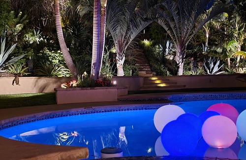 This is a well manicured home with a Mediterranean feel located in a climate where It is never too hot nor too cool . And to enjoy the weather, there is a beautifully landscape yard with a resort feel complete with a large pool, jacuzzi hot tub, gas BBQ and in ground gas fire pit. And to set the mood, there is an amazing outdoor music system. This is the perfect home/yard for small gatherings or medium size parties. The interior is bright and sunny with a great ocean and harbor view. The rooms are large and comfortable with a California king bed in the master and queen beds in the other 3 rooms. You can have music through out with an easy to use Sonos multi-room music system. The kitchen is equipped with the gourmet cook in mind. And while you are waiting for that great meal, you can enjoy a game of billiards.