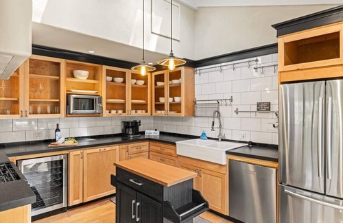 Back inside the main house, flip on the fireplace in the main living room, pouring a glass of wine before cozying up on the couch for movie night. “Tranquil Garden Getaway” offers a reverse floor plan, with the upstairs living room giving way to a sophisticated kitchen with high-end stainless-steel appliances, a wine refrigerator, and a movable island. Light fixtures dangle down from a vaulted wood ceiling in between two skylights, lending a modish vibe to the space.