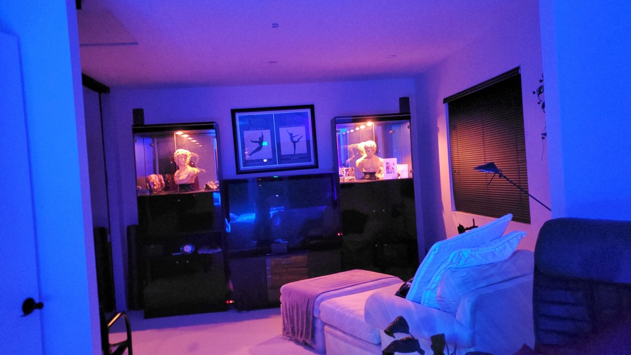 The white-carpeted modern interior is offset by black lacquer furniture and lots of mirrors reflecting it's contemporary spacious feel. The combined living and dining room is immersed in dimmed LED lights setting the tone for an intimate evening at home at the 6-person dining table, or relaxing on the sofas in front of the fireplace. Or brighten the scene for a colorful night of entertainment in the family room in front of the 75" 8K TV connected to all available DirecTV channels and explosive sound emanating from the 7.2.2 surround sound system. If music is your preference the whole-home audio-video system will whisk away the worries of the day.