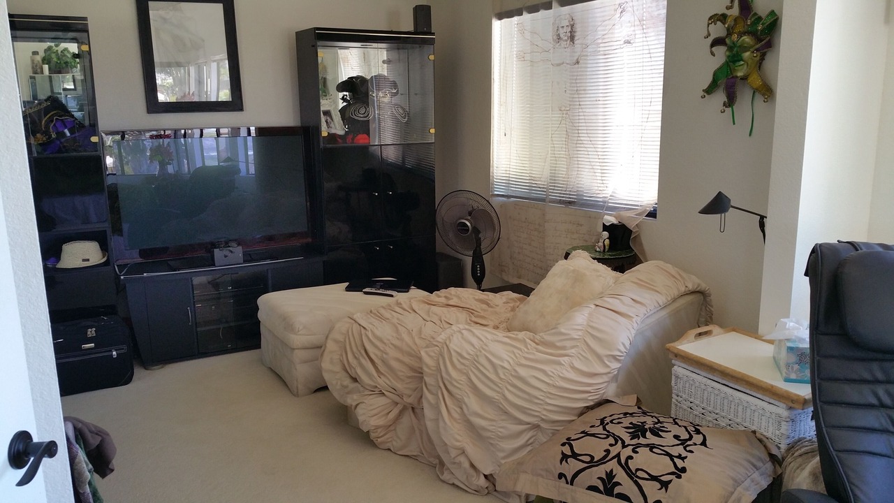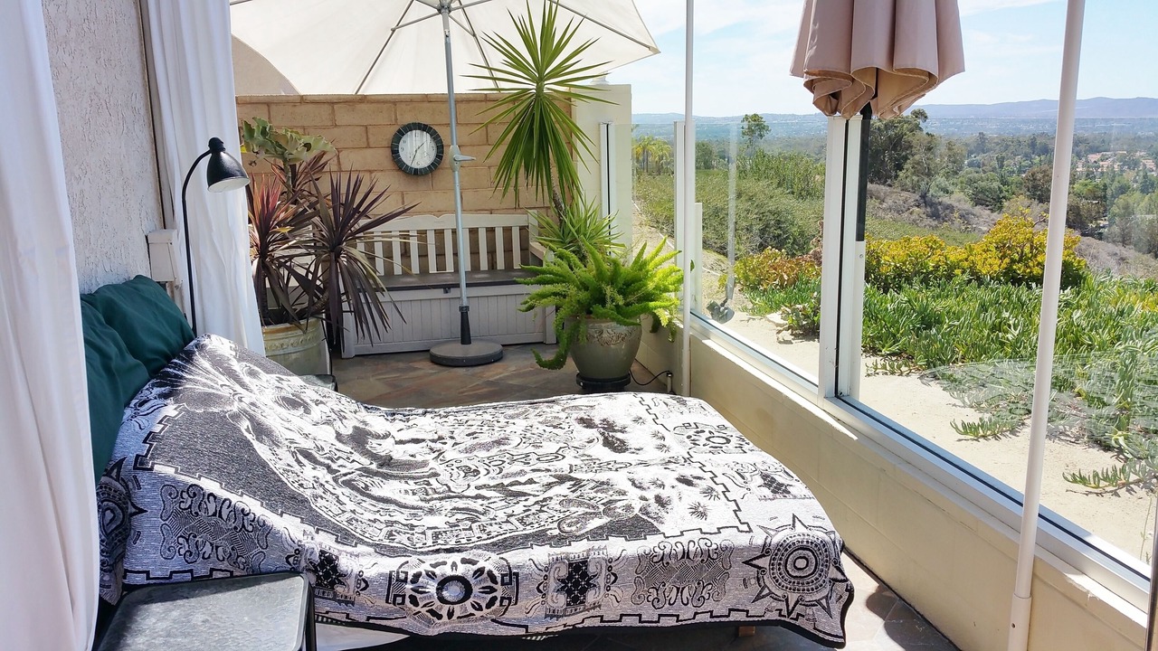 The master bedroom also has spectacular views west over all of Orange County stretching as far away as downtown Los Angeles, Palos Verdes, Newport Beach and Huntington Beach and the entire Orange County. Imagine luxuriating in the raised Cal King memory foam bed with mirrored headboard and being able to see twinkling lights as far as the eye can see! The master bathroom has his-and-her sinks and the master shower has triple shower heads for the consummate cleansing event, including the ultimate rainfall shower experience. If lounging in the master bedroom is your choice, the adjoining master retreat offers state-of-the-art relaxation with reclining electric massage chair, and lounger for viewing the 55" big screen television with it's own 5.1 surround sound system. His and her closets make storage easy for the discerning traveler.