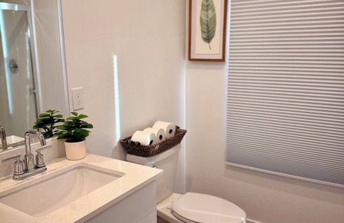 Newly built and tastefully furnished, this modern Bakersfield home offers the perfect blend of comfort and convenience. Nestled in a quiet neighborhood, it features two bedrooms—one with a king bed, the other with a queen bed—plus two bathrooms with walk-in shower, a tub, and grooming amenities.