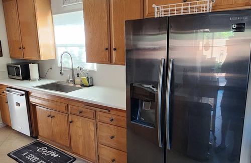 - **Details**: Stainless steel appliances. Large refrigerator with filtered water & ice, dishwasher, microwave, toster oven, retro oven, stovetop), countertops with ample prep space, natural stained cabinetry, large stainless sink with sprayer. Equipped with cookware (pots, pans, baking sheets, mixing bowls, & all the basic utensils), utensils, and dinnerware (plates, bowls, glasses) for 6. Includes a Keurig & Nespresso coffee makers, on a dedicated coffee bar cart. Oversized LG laundry machines with laundry basket. Large stainless trash cans for trash & recycling. Exterior door to side yard gives easy access from the kitchen to the big trash bins outside. (includes startup: detergent & dryer sheets for laundry, dish soap for hand washing, fresh sponge, dishwasher soap)