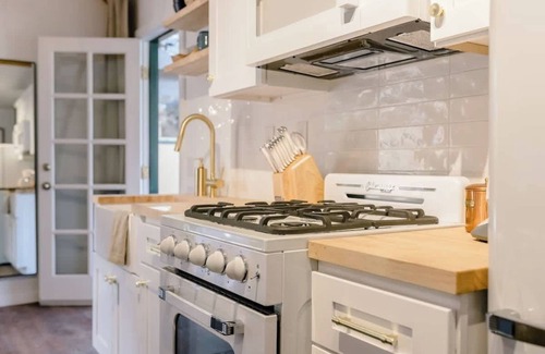 The kitchen is equipped with vintage-inspired appliances, combining aesthetic appeal with modern functionality. Whether you're preparing a quick breakfast or a gourmet dinner, you'll find all the essentials you need to make your culinary endeavors a success.