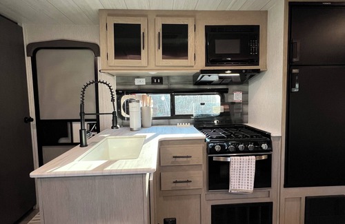 Cozy travel trailer on a quiet property with a main house, but fully private with its own entrance. Just minutes from RUHS hospital, shops, and restaurants. Features a queen bed, kitchen, fast Wi-Fi, and bathroom with indoor/outdoor access. Enjoy a private patio with table, chairs, fire pit, and grill. Ideal for professionals, couples, or small families seeking comfort and convenience.