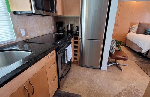 Newly renovated studio condo. New designer kitchen and granite countertops and stainless steel appliances. Travertine flooring and travertine bathroom. Full AC and heating for comfortable climate control. Fully outfitted kitchen with all the tools, plates, cups, bowls, etc should you want to cook during your stay. Two countertop height stools are included for dining. If you would like additional stools, please contact us 1 week in advance. Designated uncovered parking space is included + street parking is also available. We provide beach chairs, towels, and an umbrella. Bike rentals are available just up the street.
