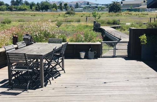 This wood paneled home has a Japanese-style peaked roof, windows and doors to the creek and marsh outside, a large view deck, 1 bedroom and bathroom with double shower, and is only two blocks to Larkspur’s famous restaurants, shops, theater, grocery store and gas station. Living, dining, kitchen have tv, fireplace, Thermador professional range. This is a home; everything you need is here. 7 miles from Golden Gate Bridge and San Francisco. An hour north to wine country. Ocean beaches 20 minutes.