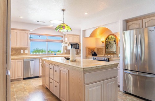 The backyard features a nice fenced yard for outdoor games. The deck is expansive so there is plenty of room to pick your spot and watch the ocean or the kids enjoying themselves in the yard.