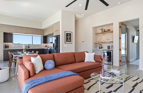 Experience Vista B. This modern 2-bedroom, 2-bathroom villa offers ensuite bathrooms, an open floorplan living room with chef's kitchen, a private pool and spa, luxury amenities, and a game room. Every detail has been thoughtfully selected to enhance the guest experience. The villa's sleek geometric exterior and earthy color palette resonates with the rugged beauty all around. Inside, the décor combines clean, modern lines with fun Mid Century accents to create a serene atmosphere that blends in with the surroundings.